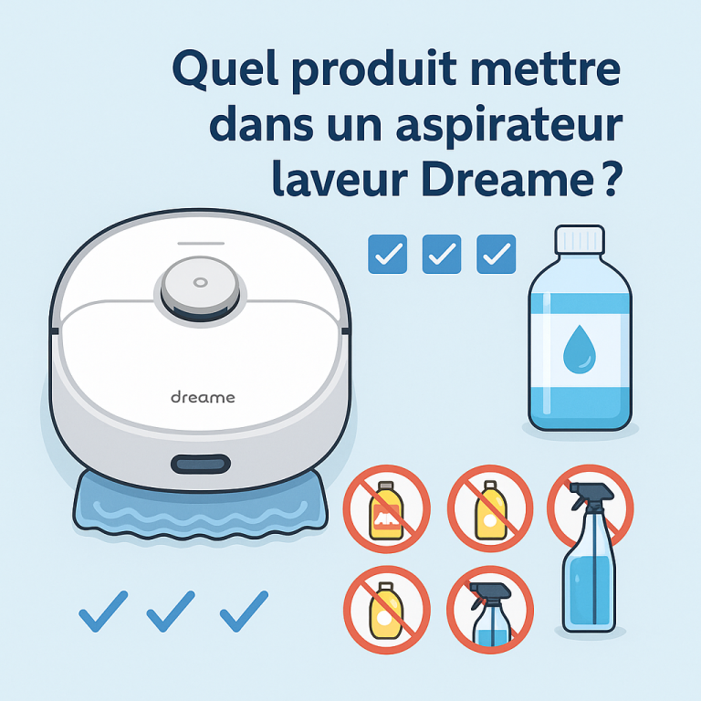 En cas de doute, la règle simple est : eau claire + détergent officiel Dreame ou détergent spécial “robots laveurs” peu moussant, très légèrement dosé. Tout le reste est à bannir.